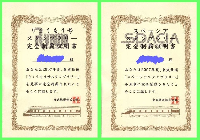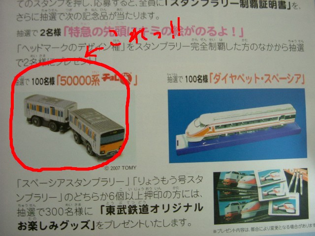| × [PR]上記の広告は3ヶ月以上新規記事投稿のないブログに表示されています。新しい記事を書く事で広告が消えます。 ![]() なんかねっ!なんか来たよっ!!届いたよっ!!! 先月「スタンプ押しに九州まで行ったくせに、地元路線のスタンプラリーを無視しちゃいかん!!」ってことで参戦してみた『りょうもう号スタンプラリー』&『スペーシアスタンプラリー』ですが… やったからには一応証明書の応募はしておこう…と送るものを送っておいたんですけどね。 そしたらね、何か届いたよっ!かさ張った封筒がっ!! 開けてみたら『スタンプラリー制覇証明書』と一緒になんか入ってるぞ! いそいそと取り出してみた。 ↓ おぉ〜っ、これはもしかして… いそいそとスタンプ帳を開いてみた。 ↓ うわぁ〜っ、マジでっ!? いそいそと箱をあけてみた。 ↓ ホントだ!チョロQだよ!!当たったよ!!! 結構ビックリ。 何せ今までの人生で『抽選』ってヤツに当たった試しがない。 すごいぞ、妹!!<え? いや、実はコッソリ妹の名前を借りて自分の分と2通送ってるんだけどね… で、当たったのは妹の方…orz もっとも、妹は知らないし電車好きでもないのでコレはそのまま私のものになるんだけどさ… でも、なんかこう…嬉しいんだか嬉しくないんだか… ちなみに私はホントは『東武鉄道オリジナルお楽しみグッズ』が欲しかったんだよ……(-。-) ボソッ 賞品にビックリしてウッカリ忘れるところだったけど、最後に証明書を取り出してみた。 ↓ 予想外に立派なシロモノで、またまたビックリ! A4サイズで金色の縁取りの入った立派な賞状タイプ!! なんか、こう…もっと小さいカードタイプのものぐらいだろうって思っていたからさ。 でも、妹名義のは…どうしよう…