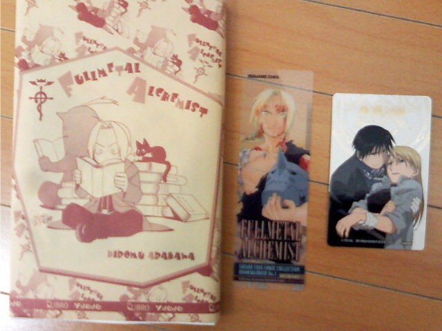 × [PR]上記の広告は3ヶ月以上新規記事投稿のないブログに表示されています。新しい記事を書く事で広告が消えます。 ![]() 別に買いたい本があったわけではないけれど仕事帰りに何となくいつもと違う本屋さんに立ち寄ってみた。 そこで看板発見! 『鋼の錬金術師の新刊に荒川弘描き下ろしオリジナルブックカバーつけるよ!』みたいな… なんだとっ!? で、そんな看板がまだ出てるって事は、この特典まだアリってことだよね… いや、でも、発売日にうっかり何の特典もないトコで買っちゃって… その後ミニ色紙につられて兄命斗でもう1冊購入しちゃったのは先月載せた通り。 ダブった1冊を友達に購入して頂いたのに、また買うわけにもいかんしな… とか思いつつも店内の売り場を見てみたら別のPOPを発見! 『鋼の錬金術師コミックスか関連書籍』って書いてあるよ! じゃ、コミックスじゃなくてもいいんだな? …ってことで、まだ持ってない『関連書籍』を選んでレジへ。 ちゃんとオリジナルブックカバーをつけてくれたよ! おまけにスクエニのコミッパフェアもやってるとかでクリアしおりもくれたよ!(^^)v るんるんしながら帰る途中でふらりと立ち寄ったお店で発見したのは『鋼の錬金術師カード付きガム』だって…こんなの出てたのかぁ〜 ガムってあんまり食べないんだけど、ついでだから買ってみた。 カードは全部で20種類もあるらしく、その中の4枚は金色の箔押しの描き下ろしレアカードですって! 出て来たカードは4枚のレアカードのうちの1枚だよ! しかも大佐と中尉だよ!(^^)v どっちもたまたま立ち寄ったお店での買い物だったけど…満足したっ! PR この記事にコメントする